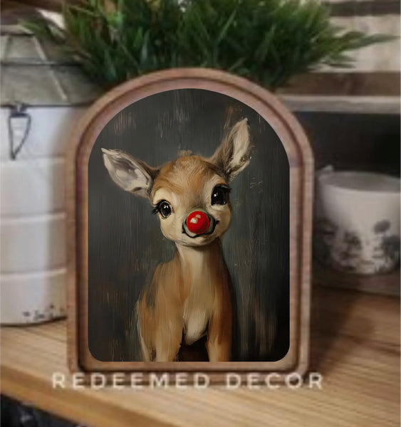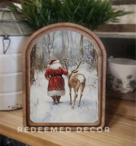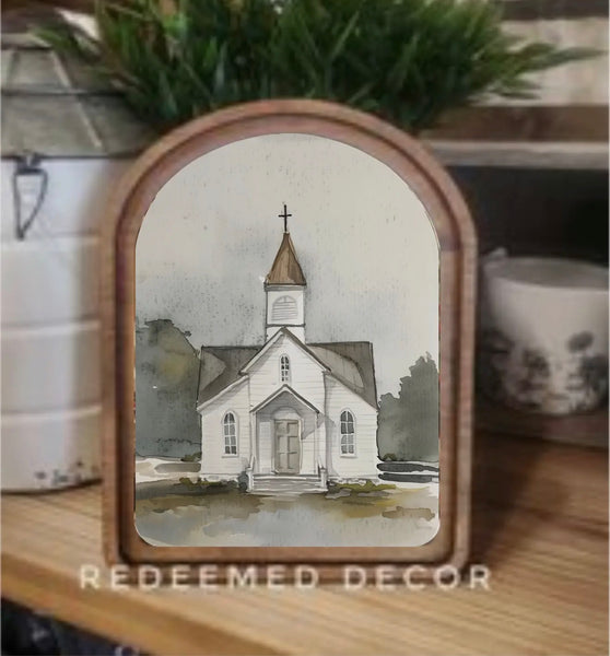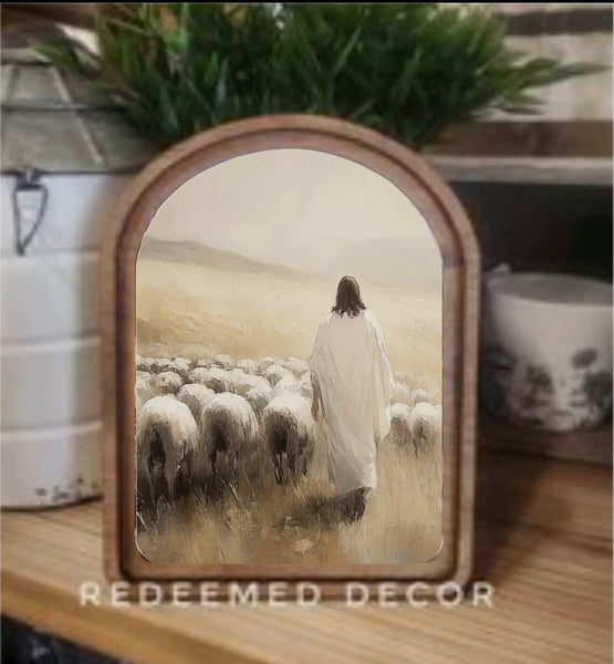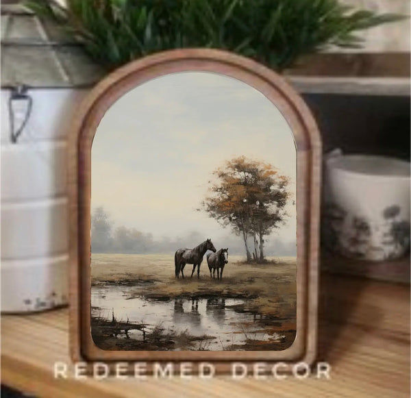 This piece has a double layered wood frame stained in a neutral Early American tone. This piece can be hung on a wall using an adhesive strip or it can sit on a shelf.