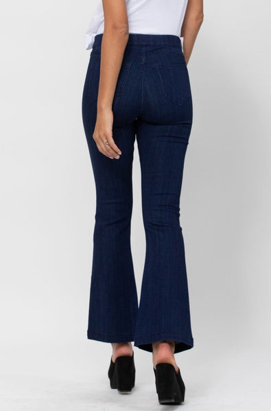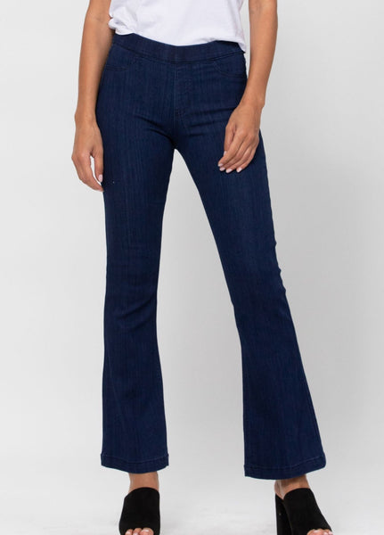 The dark denim flared jegging features an elastic waistband, faux front pockets, and that perfect flare at the bottom. Dress them up with a cute pair of wedges or dress them down with sandals. Inseam: 33" Rise: 9"