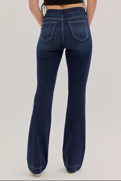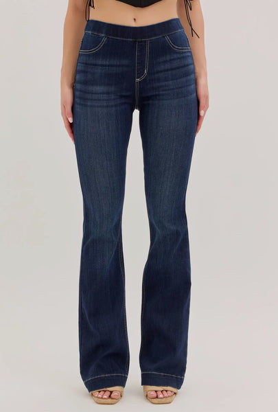 High-rise Flare jegging Dark denim Stretch Import Inseam: 33" Rise: 10" Fabric Content: 57% Cotton,26% Polyester, 15% Rayon,2% Spandex