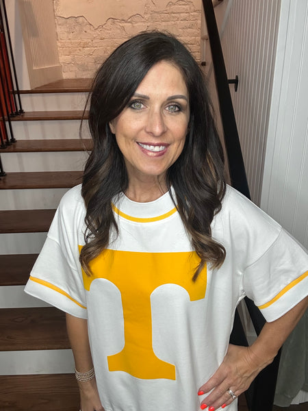 Oversized game day short-sleeve sweatshirt with bold front flocking letter graphic. Self: 85% Cotton, 15% Polyester, Cont: 65% Cotton, 30% Polyester, 5% Spandex