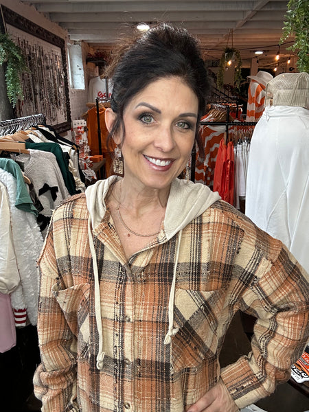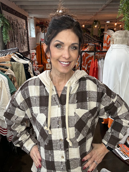 Oversized Flannel Hooded Button Down Jacket - Casual Plaid Jacket - Patch Pockets - Long Sleeve - Frayed Edge - Solid Knit Contrast CONT 56% COTTON 44% POLYESTER
