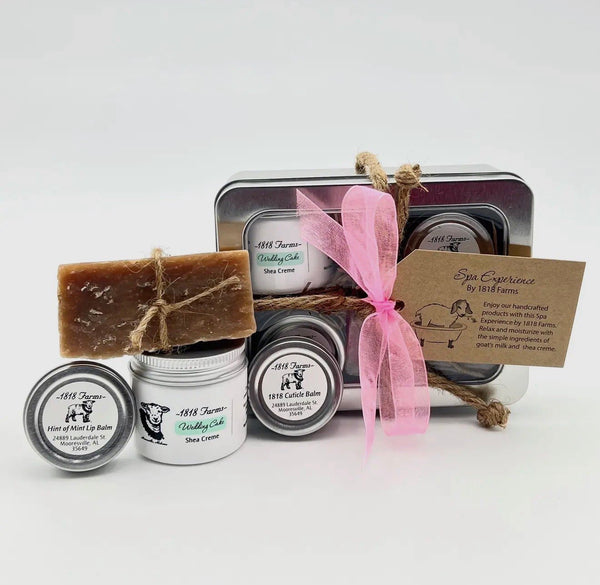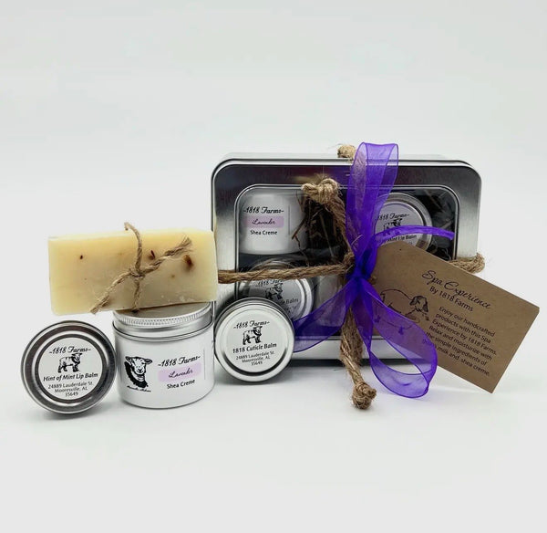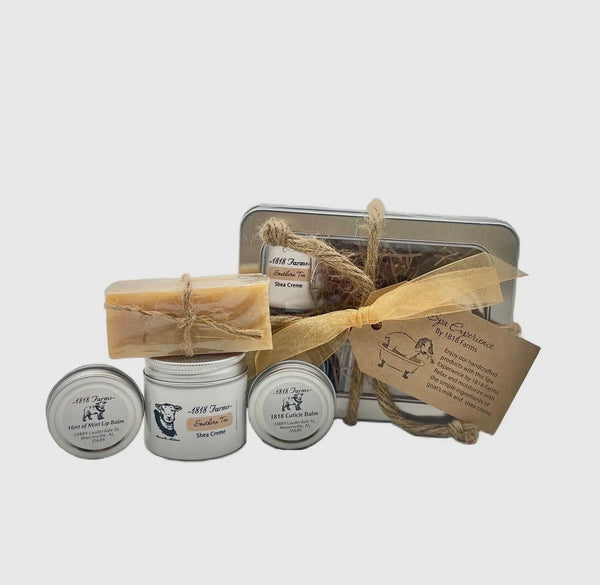 "Head to Toe" tin are made with only the finest natural ingredients. This tin includes a 2 fl oz. jar of moisturizing Shea Creme (your choice of Southern Tea, Lavender, or Wedding Cake scent), "Hint of Mint" Lip Balm, Cuticle Balm and a petite bar of soap: Southern Tea soap with Southern Tea option, Lavender soap with Lavender option and Wedding Cake with Wedding Cake option. These items are packaged in a gorgeous metal tin and wrapped using a rustic rope and ribbon.