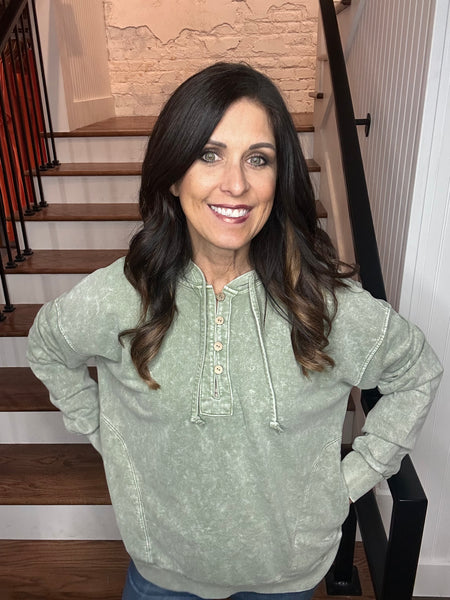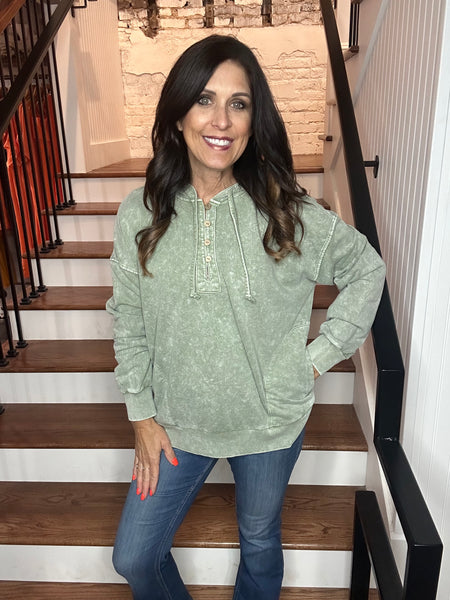 HOODED DRAWSTRING HALF BUTTON DOWN LONG SLEEVES DROP SHOULDER RIBBED DETAIL WASHED RELAXED FIT HOODED KNIT TOP SWEATSHIRT SELF: 60% COTTON, 40% POLYESTER CONTRAST: 57% COTTON, 38% POLYESTER, 5% SPANDEX