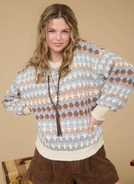 CREWNECK ROUND NECKLINE LONG SLEEVE DROP SHOULDER RELAXED FIT MULTICOLOR CIRCLE PATTERN KNIT PULLOVER SWEATER 100% POLYESTER