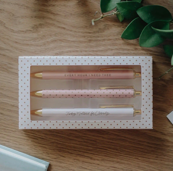 This beautiful Blush Pen Set was designed to aid you in your Bible and book studies while also providing you with a thoughtful tool that points you back to the Lord.