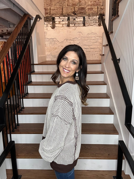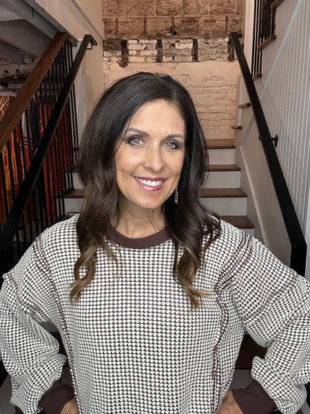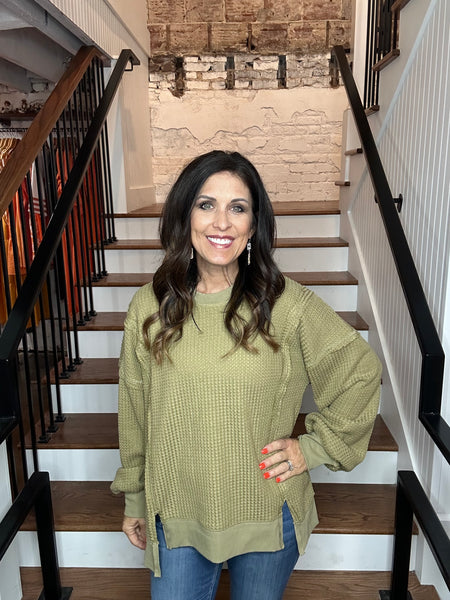 Oversized Waffle Knit Casual Top - Drop Shoulder - Round Neck - Long Sleeve - Front Slit - Raw Edge Detail