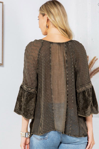 Bohemian Opulence: Velvet and Georgette Patchwork Peasant Top with Embroidery and Stonewashed Finish. Style: Bohemian, luxurious Material: Velvet, georgette Embroidery: Intricate embroidered accents Design: Patchwork peasant style with stonewashed finish Length: Regular Texture: Soft velvet with lightweight georgette Comfort: Comfortable and breathable despite the rich texture Versatility: Perfect for festivals, casual evenings, or artistic gatherings Details: Stonewashed finish and embroidery elevate the patchwork design for a unique, opulent look Care Instructions: Machine wash